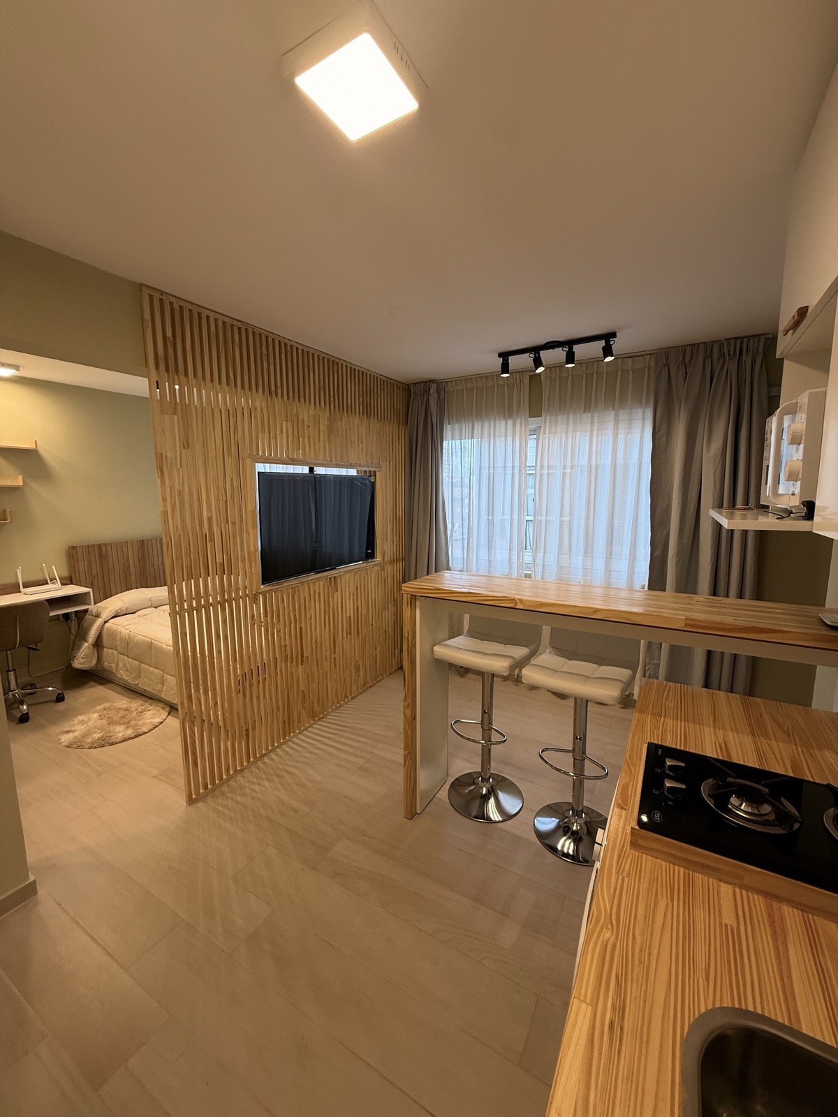 Renovación completa de un dos ambientes en el centro de Córdoba. Cocina abierta, baño moderno, pisos de porcelanato, pintura y nuevas aberturas. Resultado: un departamento luminoso y funcional.